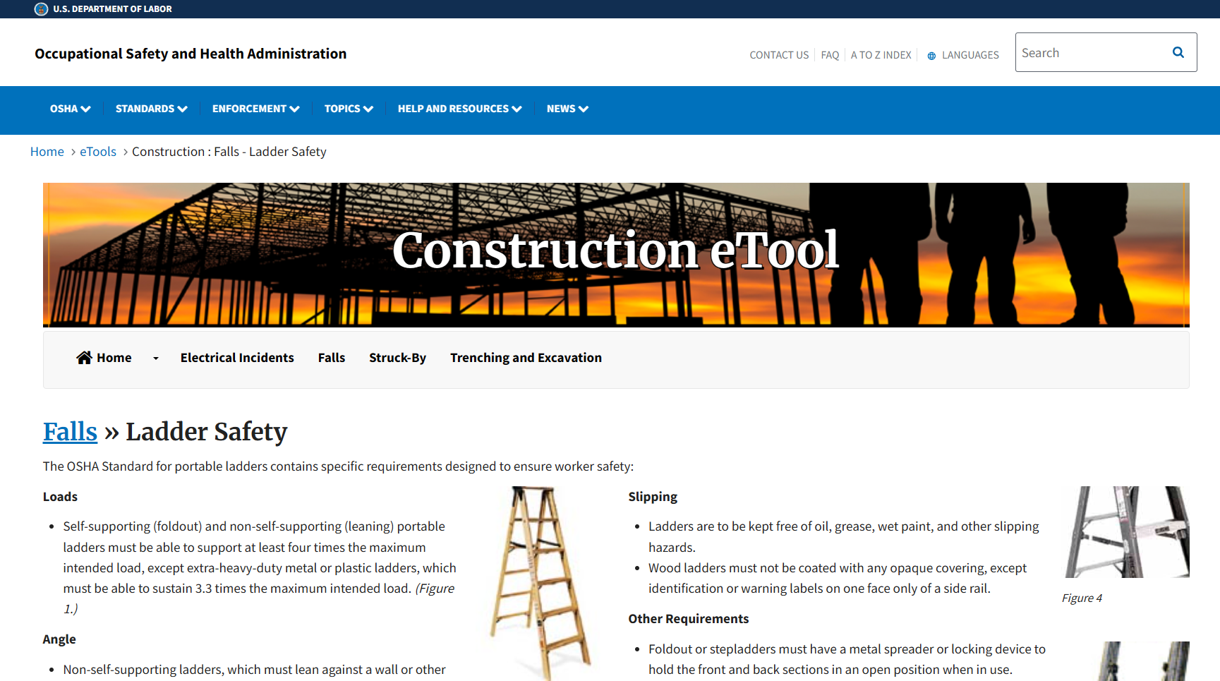 This OSHA Construction eTool page on Ladder Safety is a practical, visual reference that breaks down key portable ladder requirements from OSHA’s construction standard into clear, task-focused guidance. It explains critical setup and use rules, such as load ratings, proper ladder angles, rung spacing, slip prevention, and basic do’s and don’ts, using plain language and photos to show correct and incorrect practices. Use it as a quick field refresher, pre-task planning aid, or supervisor coaching tool to help crews verify ladder setup before work begins and reinforce OSHA expectations tied directly to 29 CFR 1926.1053.